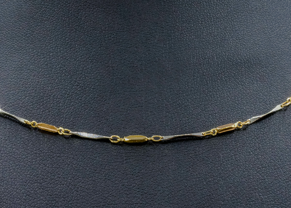 Esta elegante cadena de plaquitas presenta un doblez que la hace única. Hecha de oro 14, esta cadena es resistente y duradera, perfecta para complementar cualquier atuendo con un toque de elegancia y sofisticación. ¡Obtén un estilo exclusivo con esta cadena de doblez!